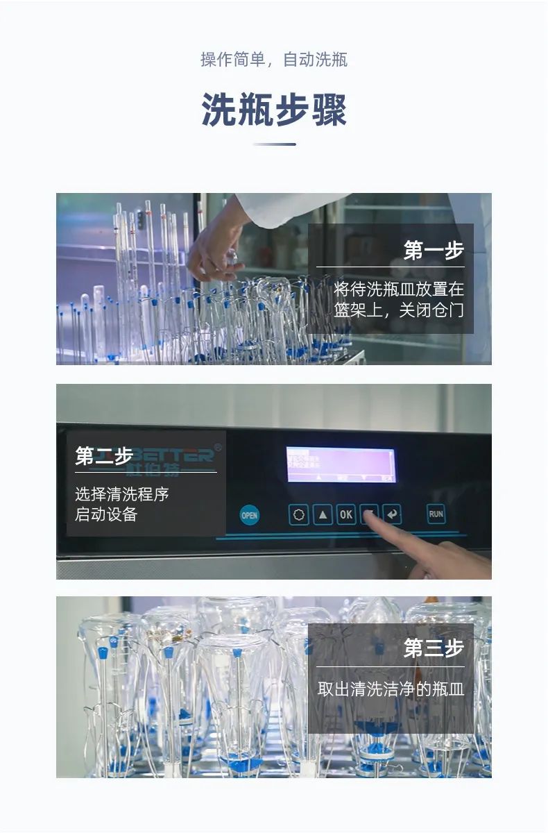 (2)它嚴格執行設定好的清洗程序,更系統化、精細化、標準化。而人工清洗難免會因為清洗人員經驗、經歷等問題,難以實現標準化清洗。并且一些瓶皿清洗要求上不能使用刷子等工具,無疑也增加了人工清洗難度。