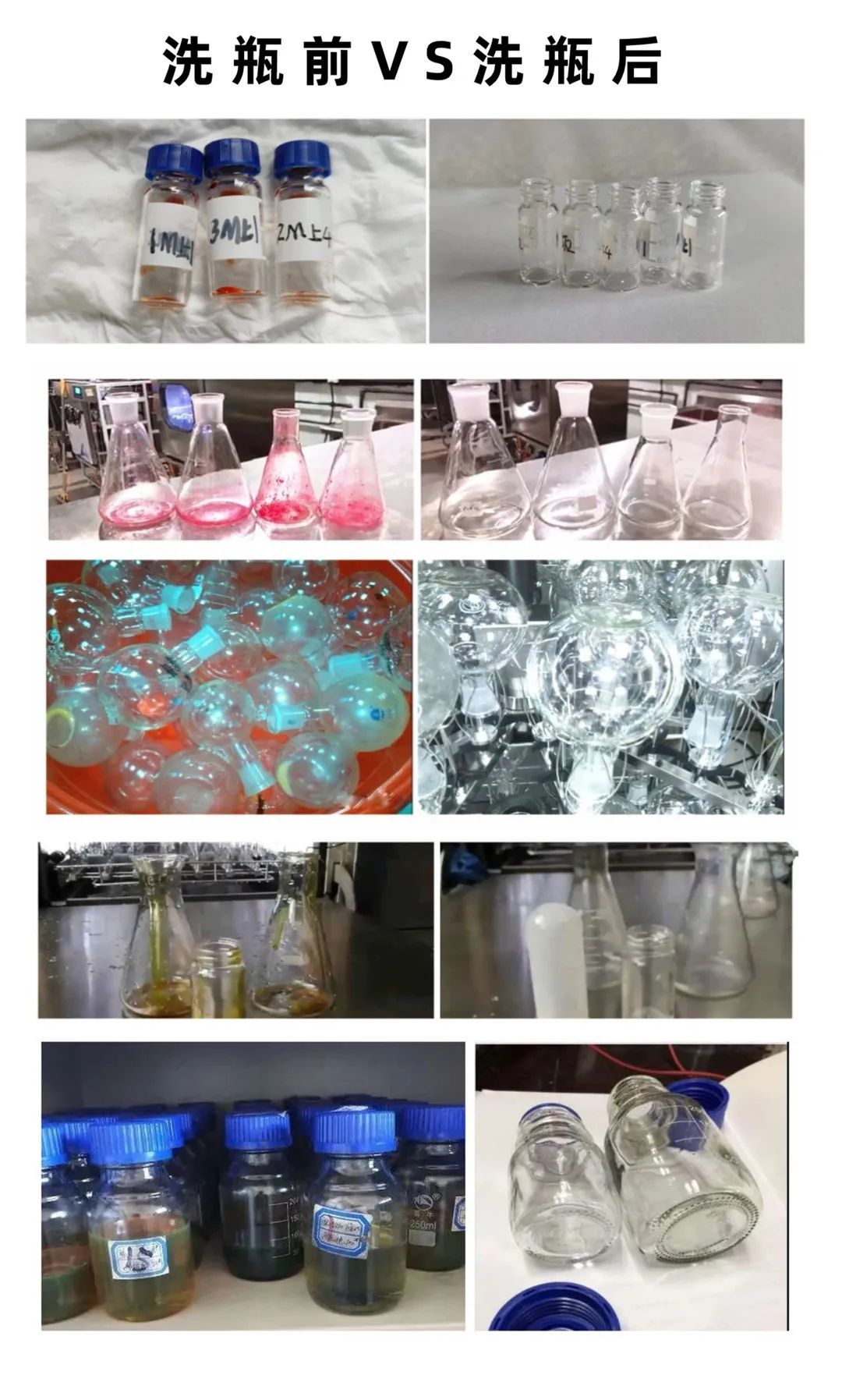 我們先看看圖,日常實驗用的瓶瓶罐罐,如:進樣瓶、取樣瓶、三角瓶、培養皿、移液管等,都可以洗凈。而且污漬不管是培養基、油污類、顏料/染料/色素類、血液/干血漬類,還是有機溶劑、小分子類等都能被它輕松洗凈。